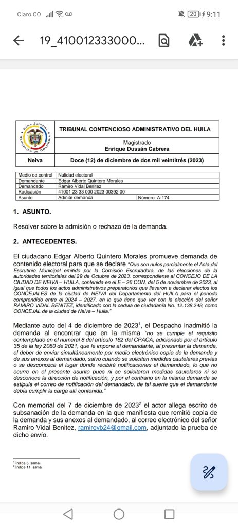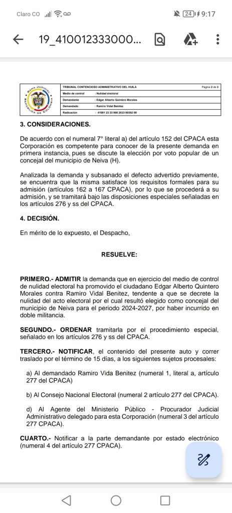 En el auto de admisión de la demanda, se indica: “Admitir la demanda que en ejercicio del medio de control de nulidad electoral ha promovido el ciudadano Edgar Alberto Quintero Morales contra Ramiro Vidal Benítez, tendente a que se decrete la nulidad del acto electoral por el cual resultó elegido como concejal del municipio de Neiva para el periodo 2024-2027, por haber incurrido en doble militancia”.
