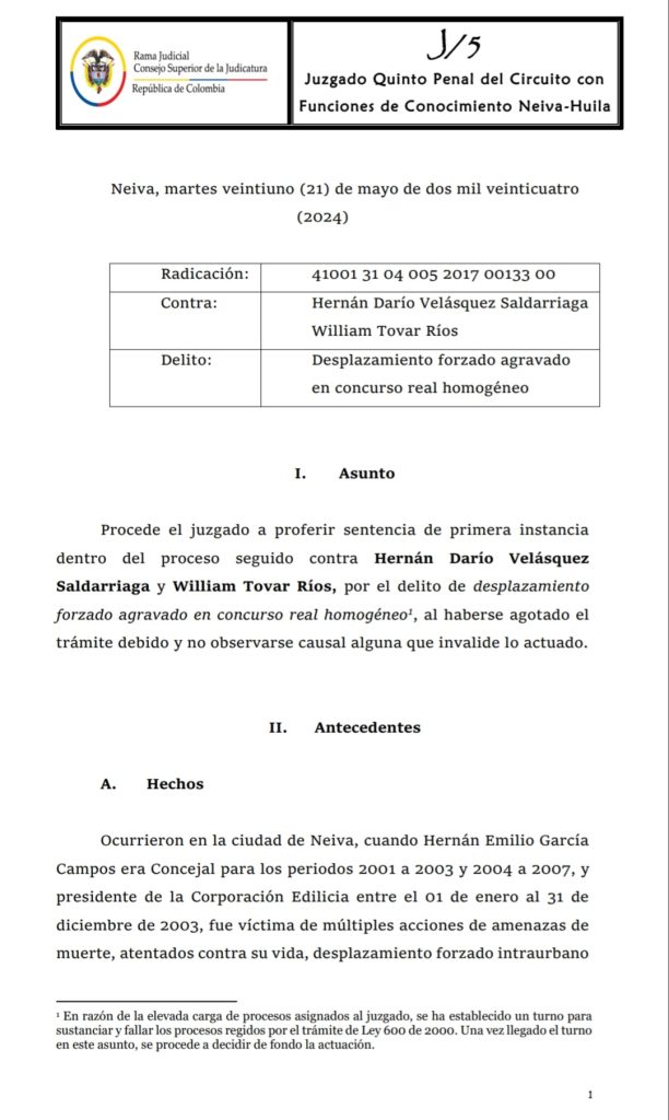Tras más de dos décadas de los hechos y dos años después de su muerte, Hernán Darío Velásquez Saldarriaga, conocido como alias «El Paisa», fue condenado a 6 años y 5 meses de prisión por el delito de desplazamiento forzado agravado en concurso real homogéneo. La sentencia se dictó por el Juzgado Quinto Penal del Circuito de Neiva y se relaciona con los hechos ocurridos en contra del exconcejal de Neiva, Hernán Emilio García Campos, entre los años 2001 y 2007.
