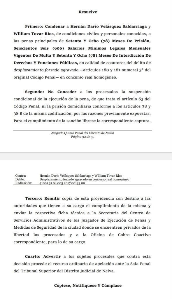 El Juzgado condenó a alias «El Paisa», y a William Tovar Ríos a 78 meses de prisión, 606 salarios mínimos legales mensuales vigentes de multa y 78 meses de inhabilitación para derechos y funciones públicas, como coautores del delito de desplazamiento forzado agravado en concurso real homogéneo.