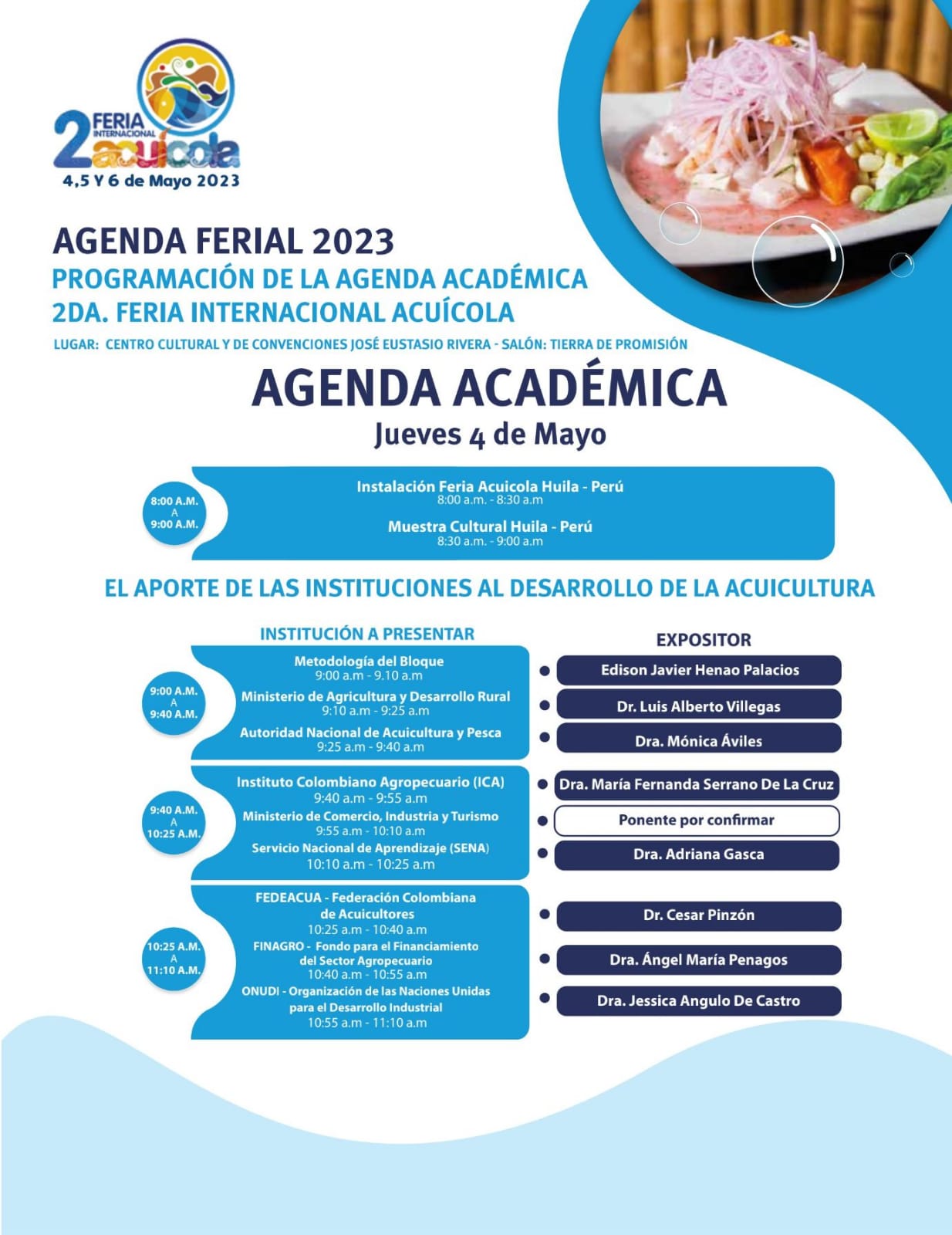 Con la agenda académica se dio inicio a la segunda Feria Internacional Acuícola en el Huila, un evento clave para la promoción de la piscicultura colombiana y una oportunidad única para los productores de la región para el intercambio de conocimientos, conocer las tecnologías disponibles y establecer contactos comerciales.
