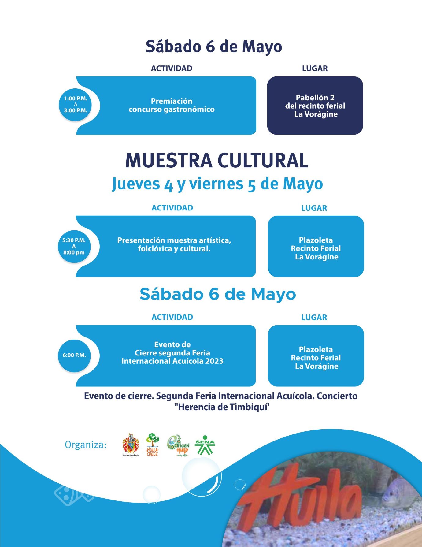 Es de resaltar que la feria se dio lugar en el departamento, ya que el Huila aporta el 40% de la producción piscícola en el país y alcanza el 80% de la tilapia y otros pescados que se exportan.