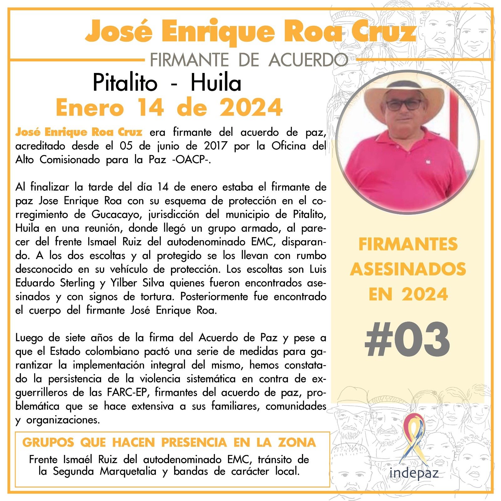 Indepaz y el Observatorio de Paz, confirmaron recientemente el homicidio de José Enrique Roa Cruz, firmante del Acuerdo de Paz, acreditado por la Oficina del Alto Comisionado para la Paz.