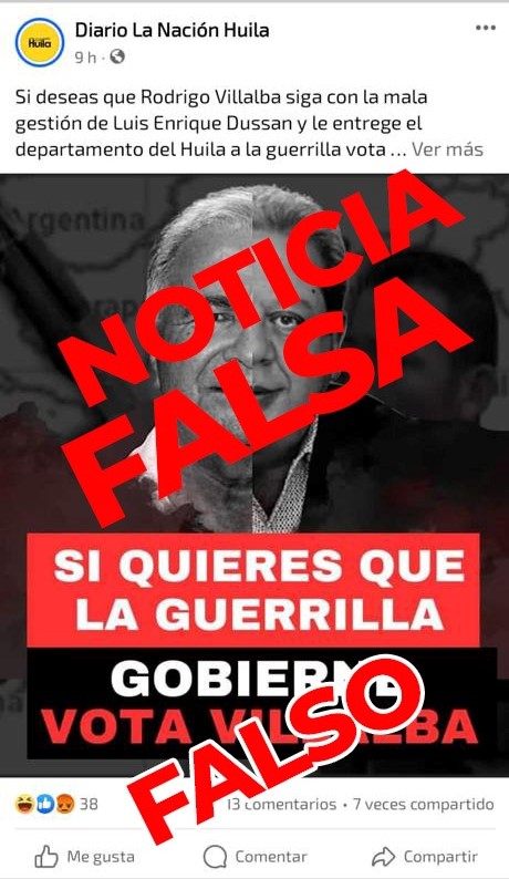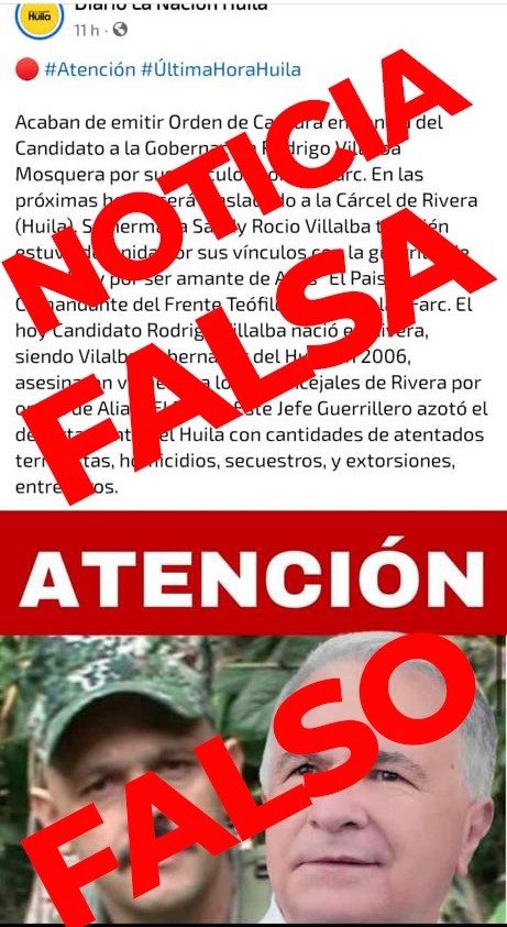Uno de estos reportes falsos sugiere la detención del candidato a la Gobernación del Huila, Rodrigo Villalba Mosquera, alegando supuestos vínculos con las FARC a través de su hermana, Sandy Rocio Villalba, quien es acusada de tener una relación sentimental con el alias «El Paisa». Esta información errónea fue difundida en la página de Facebook «Diario La Nación Huila».