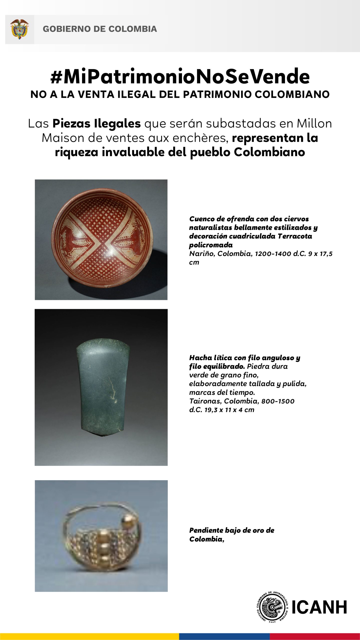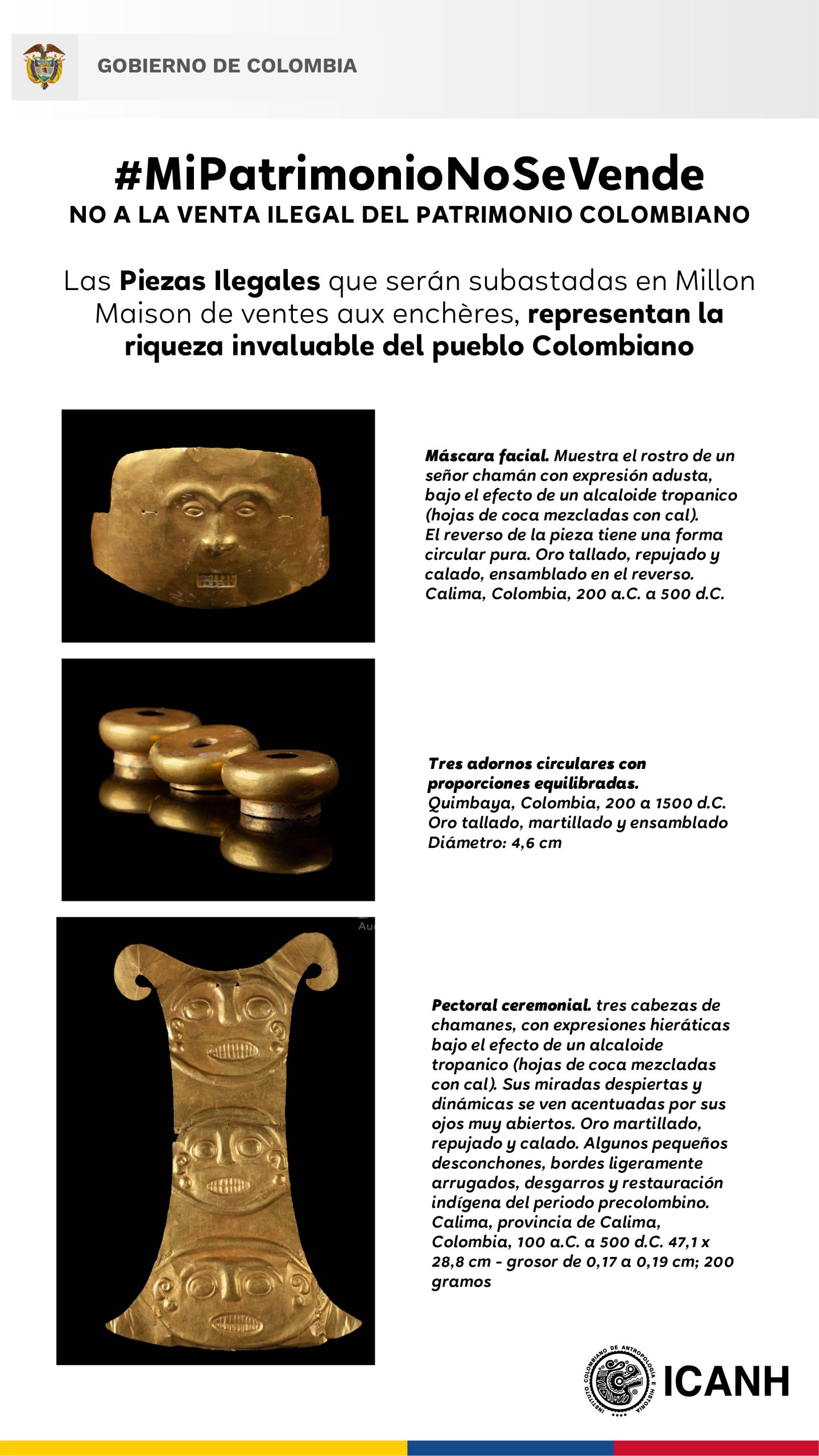 Hoy tienen programada la subasta “Los Imperios de Luz (IV) Colecciones Privadas Europeas de Arte Precolombino” por la casa de subastas Millon et Associés, de Francia, en la que se presentan ocho piezas pertenecientes al patrimonio arqueológico colombiano. Situación que ha generado rechazo de países latinoamericanos.