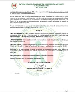 De esa manera, por segunda vez consecutiva se declara desierto este proceso con el que se busca contratar la construcción de la nueva ESE Hospital Departamental San Vicente de Paúl, del municipio de Garzón, Huila.