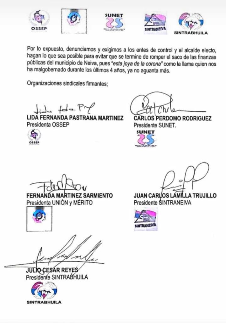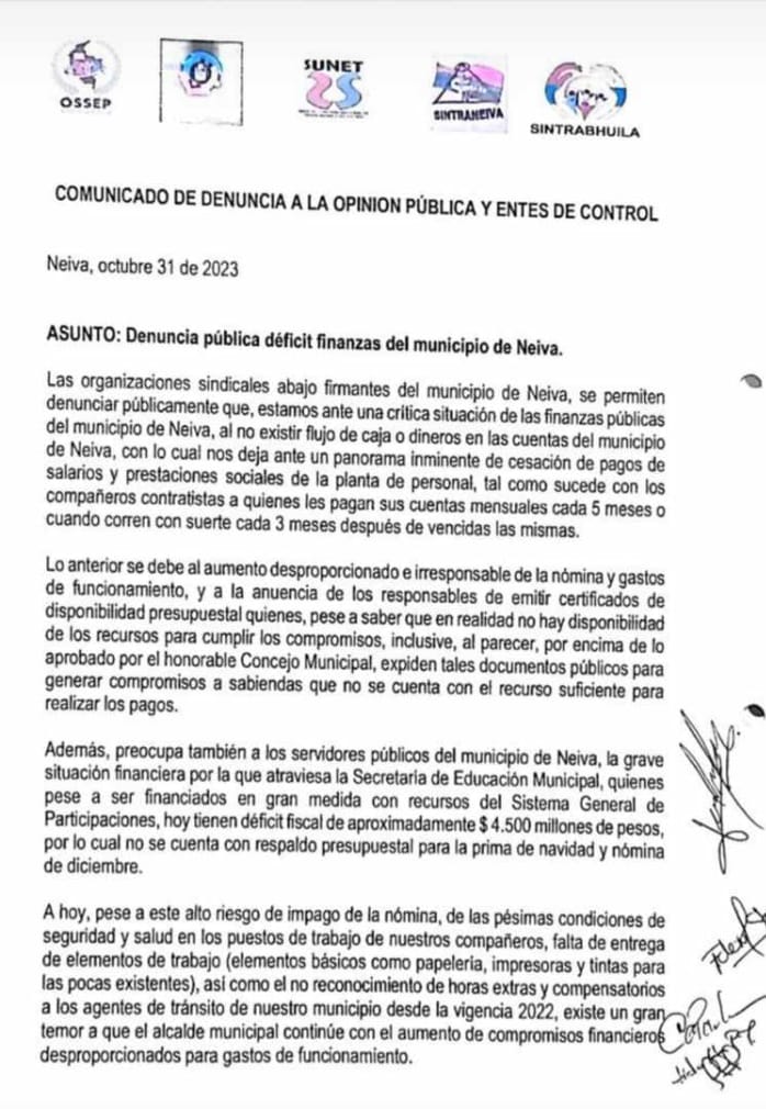En medio de la sesión en la corporación, la concejala Lourdes Mateus expuso una preocupante denuncia por parte de los sindicatos de la Alcaldía de Neiva. Alertaron sobre la difícil situación financiera que atraviesa el municipio y cómo esto ha repercutido en los pagos de contratos.