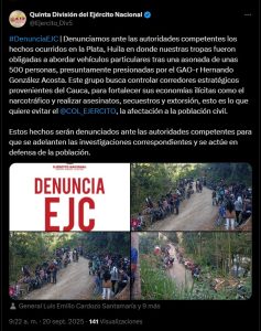 El Ejército Nacional denunció públicamente un grave hecho de alteración del orden público ocurrido en el municipio de La Plata, Huila, donde cerca de 500 personas habrían protagonizado una asonada que obligó a las tropas a abordar vehículos particulares. Según la institución, la acción habría sido promovida por el Grupo Armado Organizado residual (GAO-r) Hernando González Acosta, que busca controlar corredores estratégicos provenientes del Cauca.