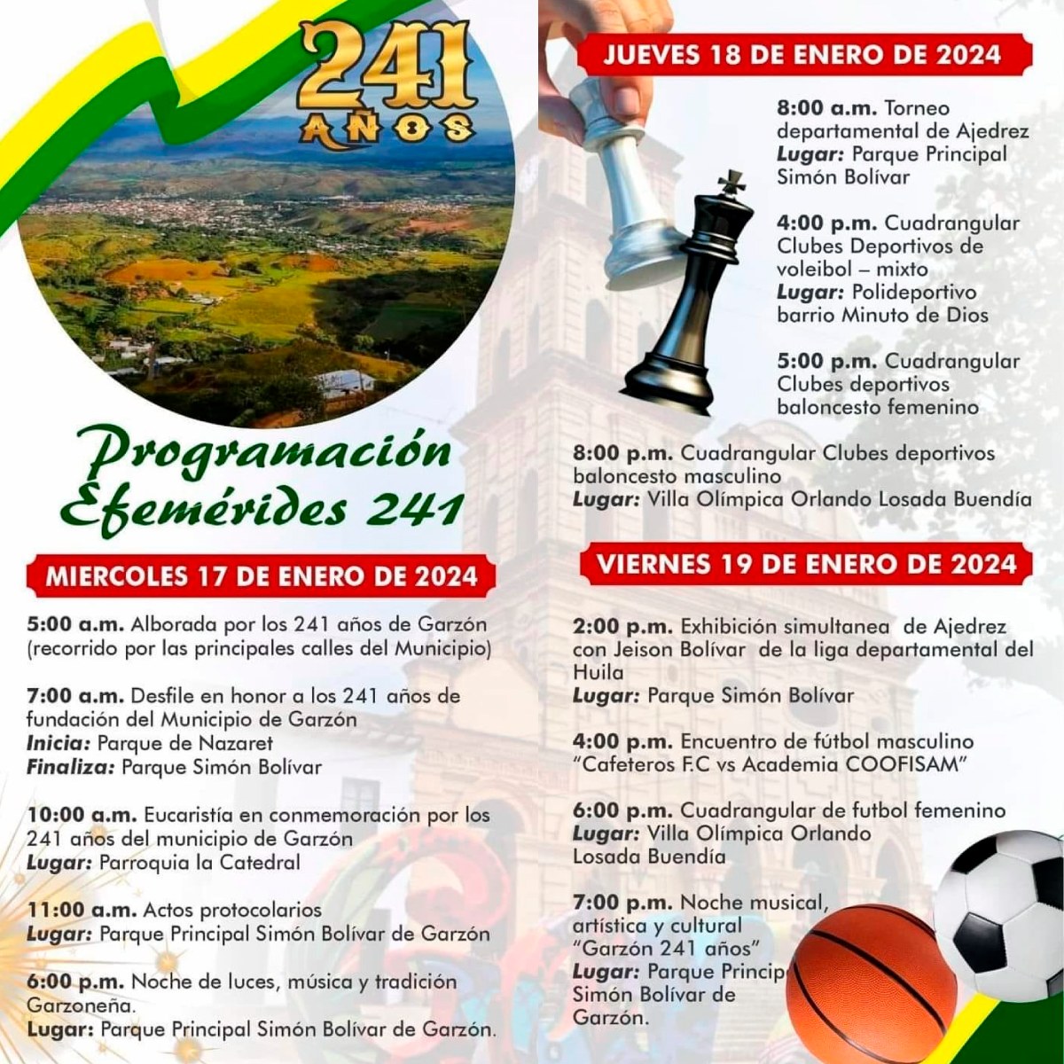 Con una variada programación el municipio de Garzón celebrará sus 241 años de fundación e historia.