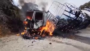 Un camión terminó incinerado, al parecer por el no pago de extorsión a un grupo criminal.