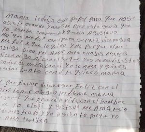 “Mamá le dejo este papel para que no se asuste cuando ya no este, pero usted sabía que yo estaba enamorada y quería a Gustavo, así que me fui con él para su país, Nicaragua”, cita la carta de la menor de edad. La nota que se supuestamente redactó Rosa, expone los motivos de su amor hacia Gustavo y pidió a su madre que “no se enoje”.