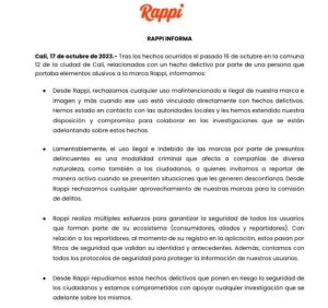 El hecho causó indignación entre la comunidad caleña y también de la marca Rappi, que no dudó en pronunciarse sobre este lamentable hecho. A través de un comunicado a la opinión pública, la empresa se permitió informar que “Desde Rappi rechazamos cualquier uso malintencionado e ilegal de nuestra marca e imagen y más cuando ese uso está vinculado directamente en hechos delictivos. Hemos estado en contacto con las autoridades locales y les hemos extendido nuestra disposición y compromiso para colaborar en las investigaciones que se están adelantando sobre estos hechos”, dijo la compañía.